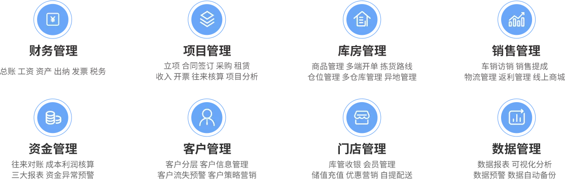 總賬、工資、資產、出納、發票、 稅務一體化管理。