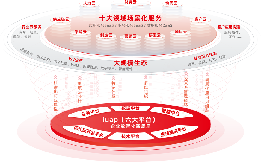 YonBIP設計和實現了云原生、元數據驅動、中臺化、數用分離的新一代技術架構,將各種數智化技術與創新需求融合,讓商業創新更便捷;同時基于社會化商業、事項法會計、特征體系、多維組織等應用架構,支持社會級數字化建模,支撐財務、人力、供應鏈等領域構建更精細多維、彈性擴展的業務場景。